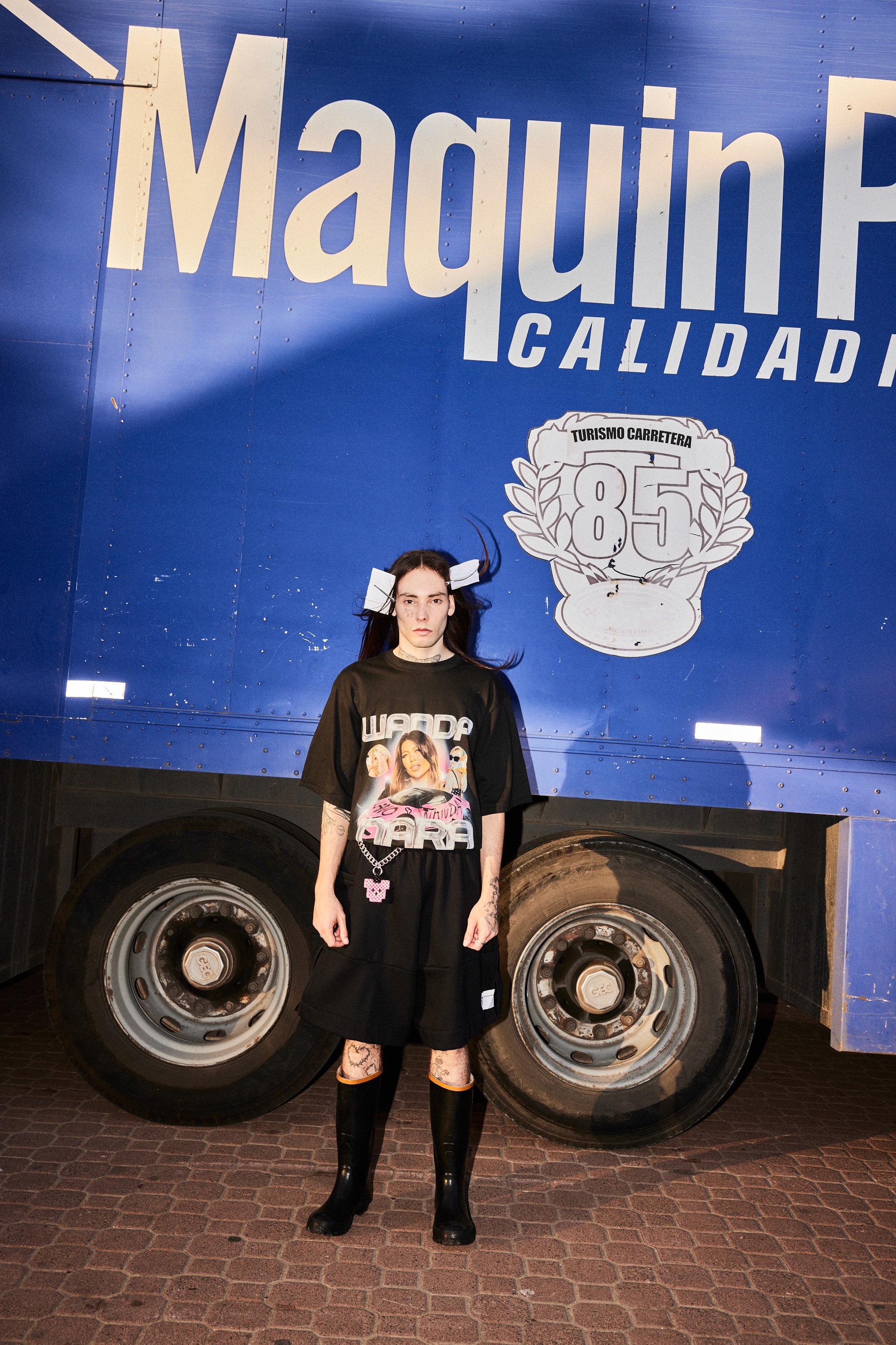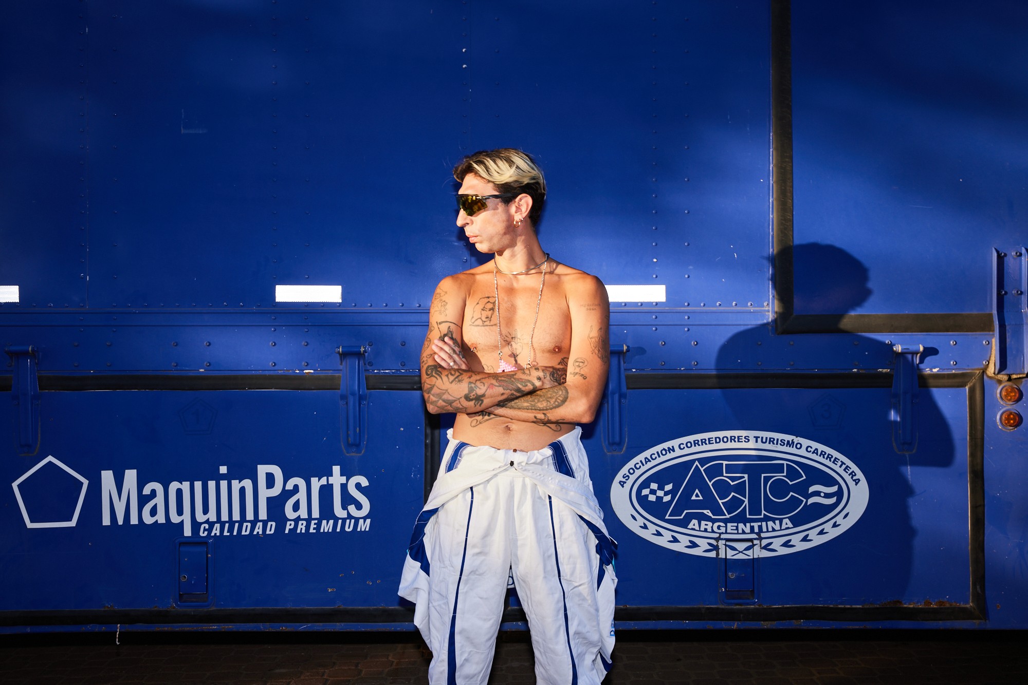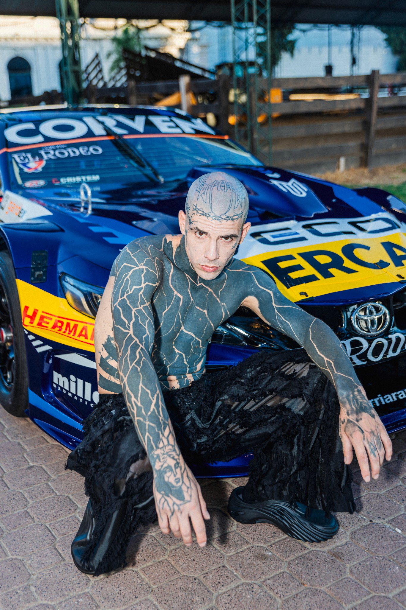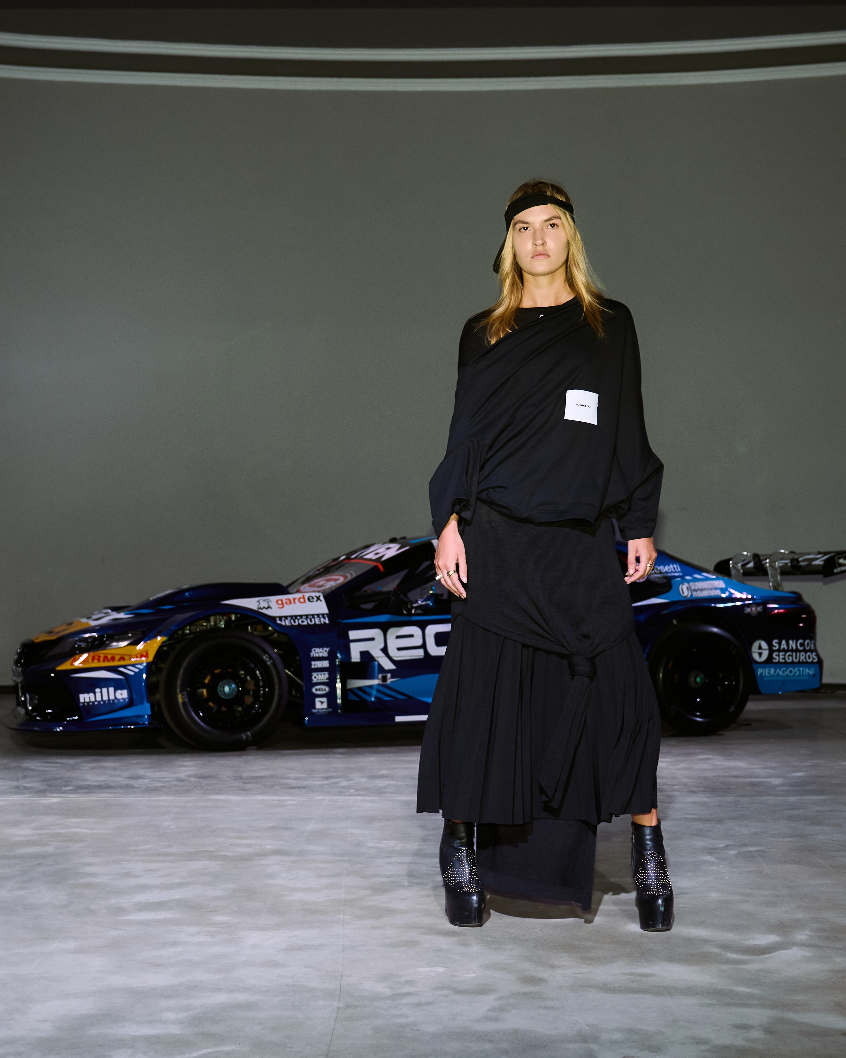 La presentación incorpora un auto de competición como pieza escultórica central, en articulación con la ACTC (Asociación Corredores Turismo Carretera). El vehículo es puesto a disposición por Manuel Urcera, reforzando el vínculo entre ingeniería de alto rendimiento, cultura de pista y narrativa local. Trajes oficiales de carrera intervenidos desde el universo DECRISCI amplifican el diálogo entre precisión técnica y gesto autoral. La pasarela se concibe como experiencia: un territorio donde velocidad, estructura y cuerpo entran en fricción.